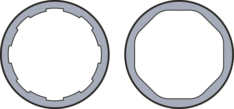 Varoitus koskee vain oikealla olevaa polygonaalirihlausta. Se ei koske vasemmalla olevaa perinteistä rihlausta, jossa on rihlapalkit ja -urat.
