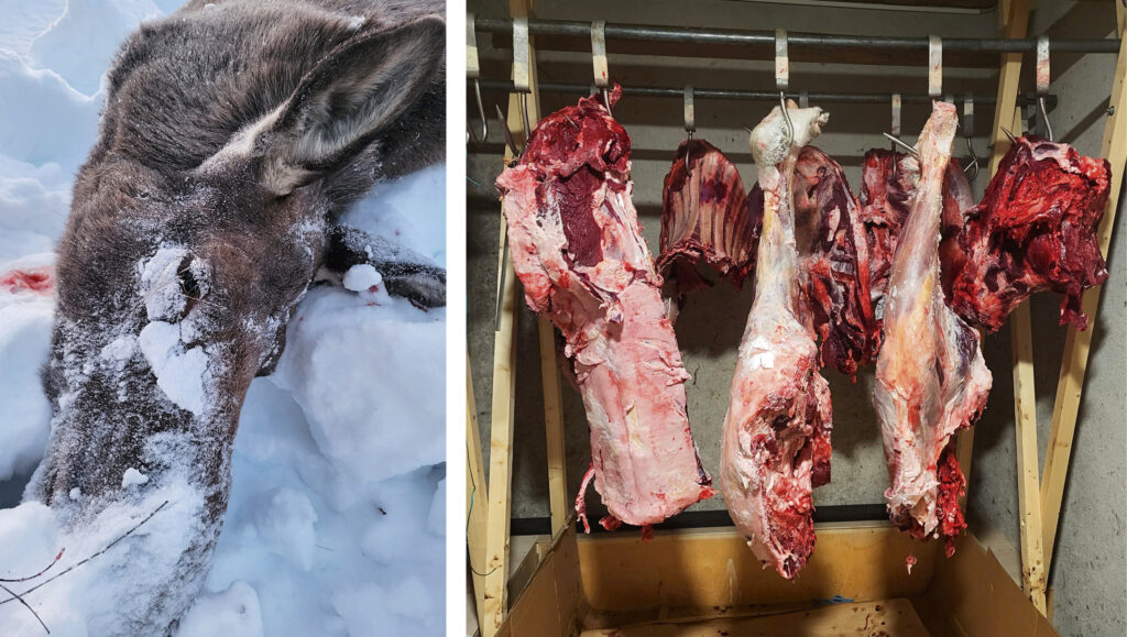 Kun saimme taituroitua itsemme poroaidan yli, lähdimme kahlaamaan umpihangessa 33 asteen pakkasessa hirveä kohti. Jäljet löytyivät, ja kuljimme niitä pitkin niin nopeasti kuin pystyimme. Olin niin keskittynyt maaston tarkkailuun, että törmäsin edessäni olevaan paksuun ja matalaan oksaan. On siis hyvä tarkkailla myös eteensä.