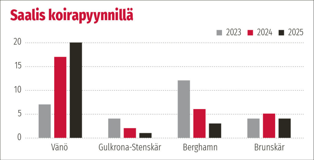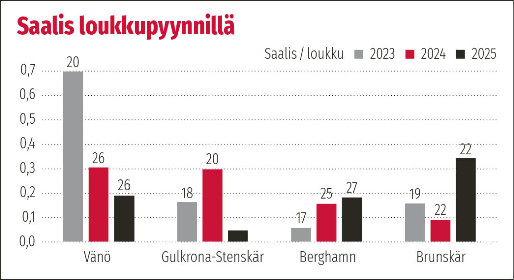 Muilla alueilla koirapyyntiä on toteutettu tasaisemmin. Poikkeuksena on Brunsär, jonka pyynti jäi väliin keväällä 2025. Tässä saattaa piillä syy siihen, miksi aikaisemmin loukkusaaliin osalta rauhalliselta alueelta saatiin syksyllä 2025 yhdeksän loukkuminkkiä.