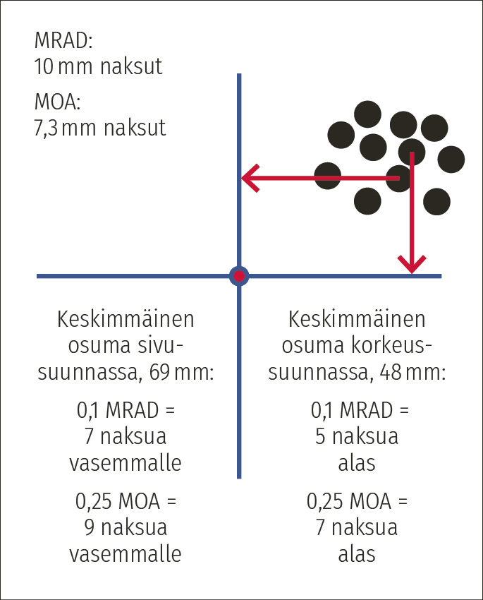 - Tee tarvittava korjaus, huomioi etäisyys. Esim. 10 metrin päästä ampuessa yksi 0,1 MRAD naksu siirtää osumaa yhden millimetrin, 20 metrin päässä kaksi millimetriä