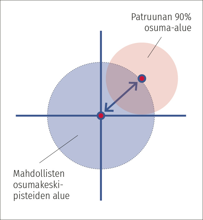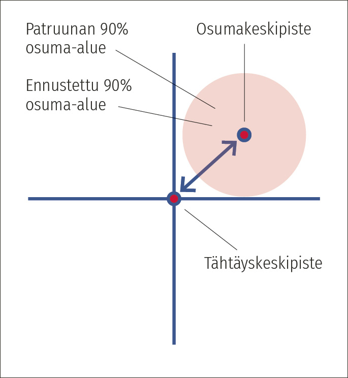 Käsite ”ennustettu osuma-alue” sisältää siten sekä patruunan käynnistä että kohdistuksen epätarkkuudesta aiheutuvan epävarmuuden. ”Patruunan osuma-alue” puolestaan kuvaa pelkästään patruunan käynnin hajontaa.