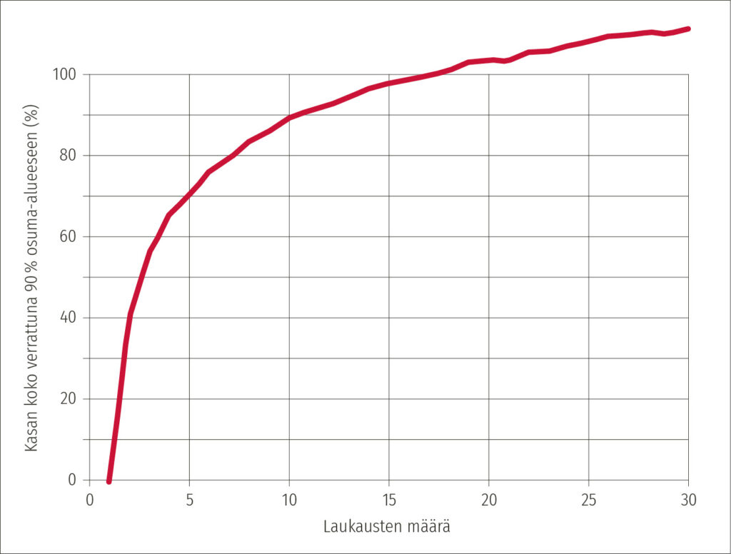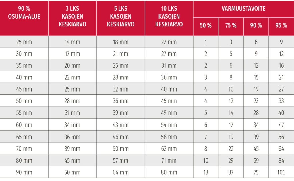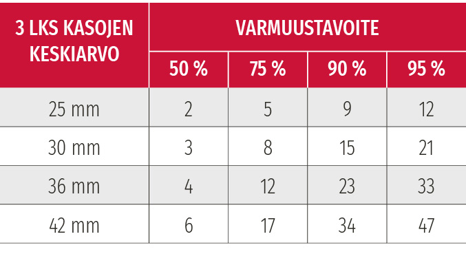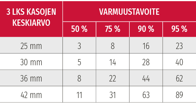 Jos taas kolmen laukauksen osumakuvioiden keskiarvo olisi ollutkin 30 mm, eikä 25 mm, olisi 90 prosentin kohdistukseen tarvittu 15 laukausta.