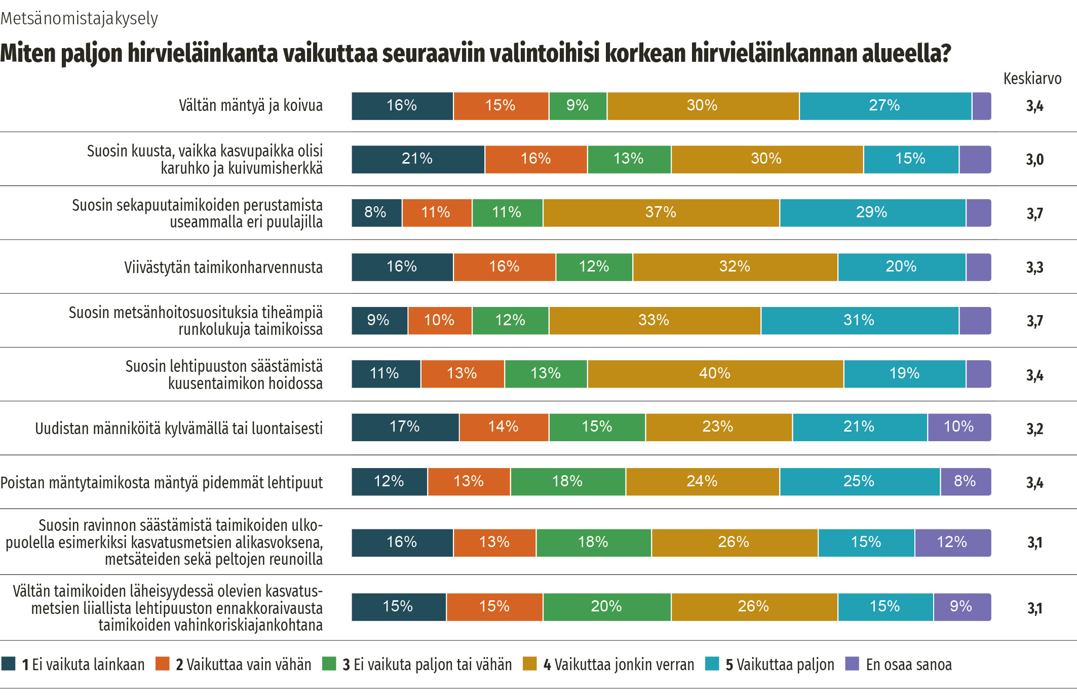 Kyselyyn vastanneista maanomistajista 57 prosenttia kertoi välttävänsä mäntyä ja koivua uudistamispuulajina korkean hirvivahinkoriskin alueilla. Lisäksi 45 prosenttia vastaajista ilmoitti suosivansa kuusta karuilla ja kuivilla kasvupaikoilla, joissa vahinkojen riski on tavallista suurempi. 66 prosenttia vastaajista painotti sekaviljelyä joko paljon tai jonkin verran.