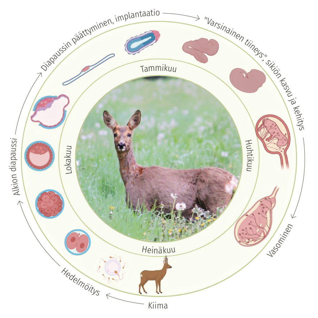 Hedelmöittynyt metsäkauriin varhaisalkio ei kiinnity kohdun seinämään, vaan jää diapaussin ajaksi kellumaan kohdun nesteeseen. Sen kehitysvauhti hidastuu, ja solujen toiminnot hiljenevät.