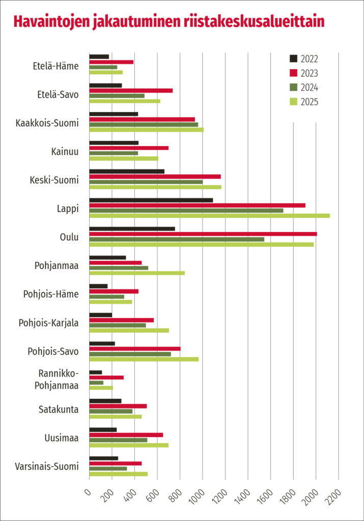 Eniten havaintoja kirjattiin pinta-alaltaan suurilta Lapin ja Oulun riistakeskusalueilta. Metsästäjämäärään suhteutettuna ahkerimmin havaintoja kirjattiin Keski-Suomen, Kaakkois-Suomen ja Lapin riistakeskusalueilla, vähiten Uudenmaan ja Rannikko-Pohjanmaan riistakeskusalueilla. Alueiden vertailu ei kuitenkaan suoraan kerro kyseisten alueiden metsästäjien aktiivisuudesta, koska havaintoja on voitu kirjata myös kotiseutujen ulkopuolelta.