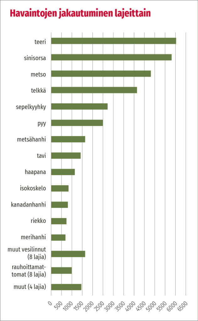 Eniten havaintoja kirjattiin teeristä, sinisorsista, metsoista, telkistä, sepelkyyhkyistä ja pyistä. Nämä havainnot kattoivat lähes 70 prosenttia kaikista kirjauksista. Mainitut lajit ovat riistalajeista runsaslukuisimpia ja esiintyvät lähes koko maassa, joten havaintojen suuri osuus oli odotettua. Metsähanhihavaintoja kirjattiin ilahduttavan paljon, mutta yli puolet kirjauksista oli selkeitä muuttohavaintoja, eivätkä viitanneet hanhien pesintään havaintopaikan lähistöllä.