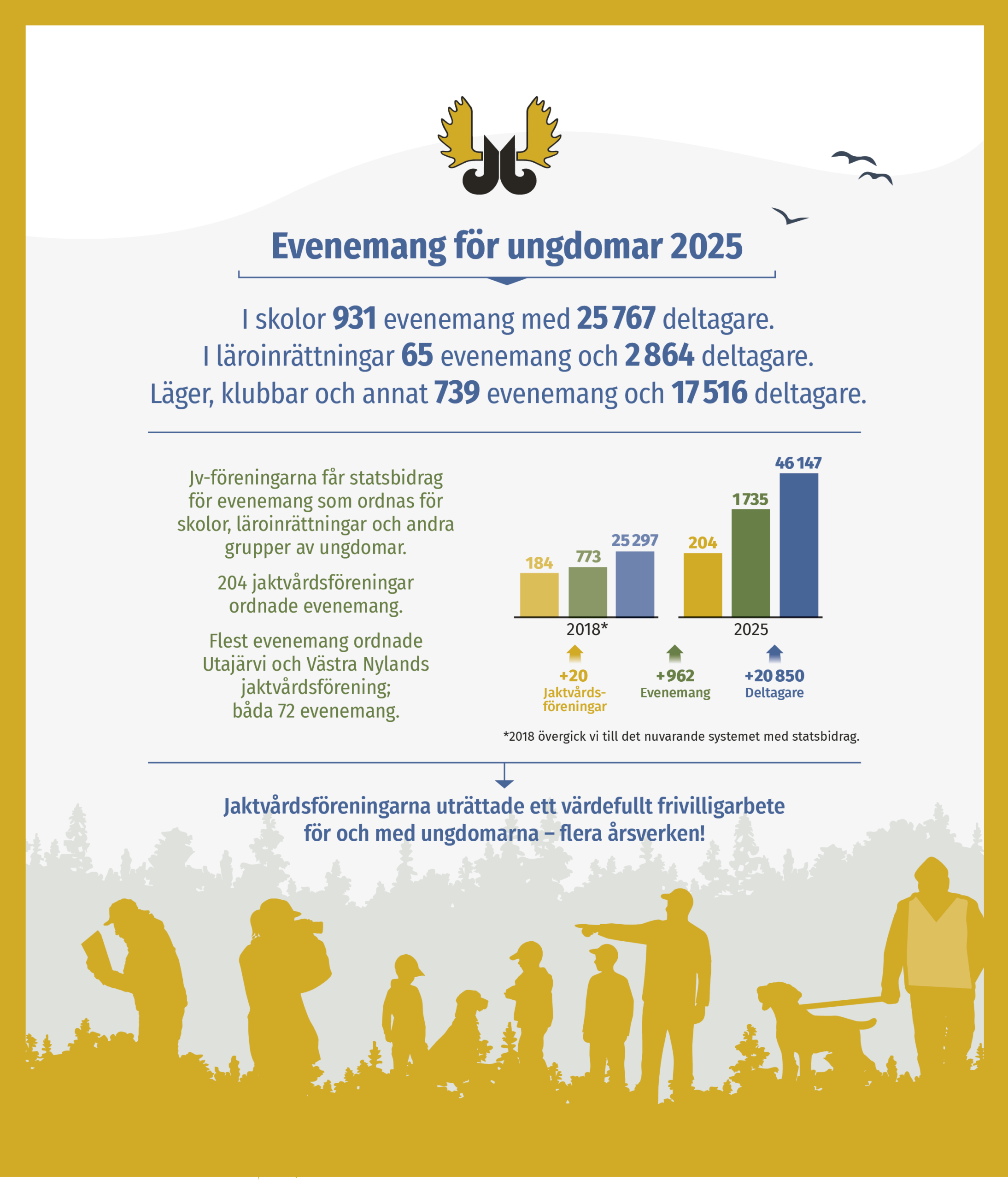 Dela Aktuellt Fantastiska siffror för jv-föreningarnas ungdomsarbete! Publicerad17.4.2026 Taggarfrivilligarbetejaktvårdsföreningungdomsarbete