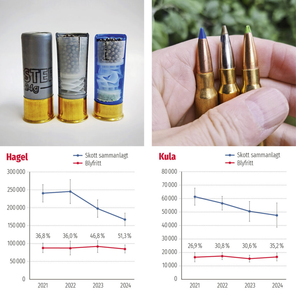 För studsarpatronernas del har utvecklingen varit likartad, det vill säga att det totala antalet avfyrade patroner har minskat (2021: 0,6 miljoner, 2024: 0,5 miljoner) medan andelen blyfria patroner har ökat (2021: 27 %, 2024: 35 %).
