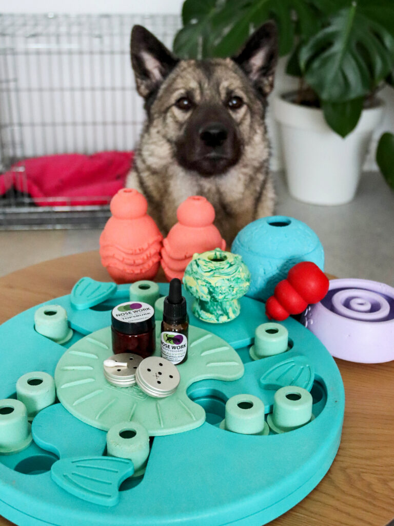 Att lära sig nytt och att använda nosen kan för hunden bli en aktivitet som tar mera på krafterna än en löprunda. När undertecknad övergick från höst till hundledigt började jag träna nosework med min älghund. I den här grenen ska hunden leta efter en viss doft, exempelvis eukalyptus, och markera sitt fynd (genom att till exempel sätta sig eller peka med blicken), och får därefter en belöning.
