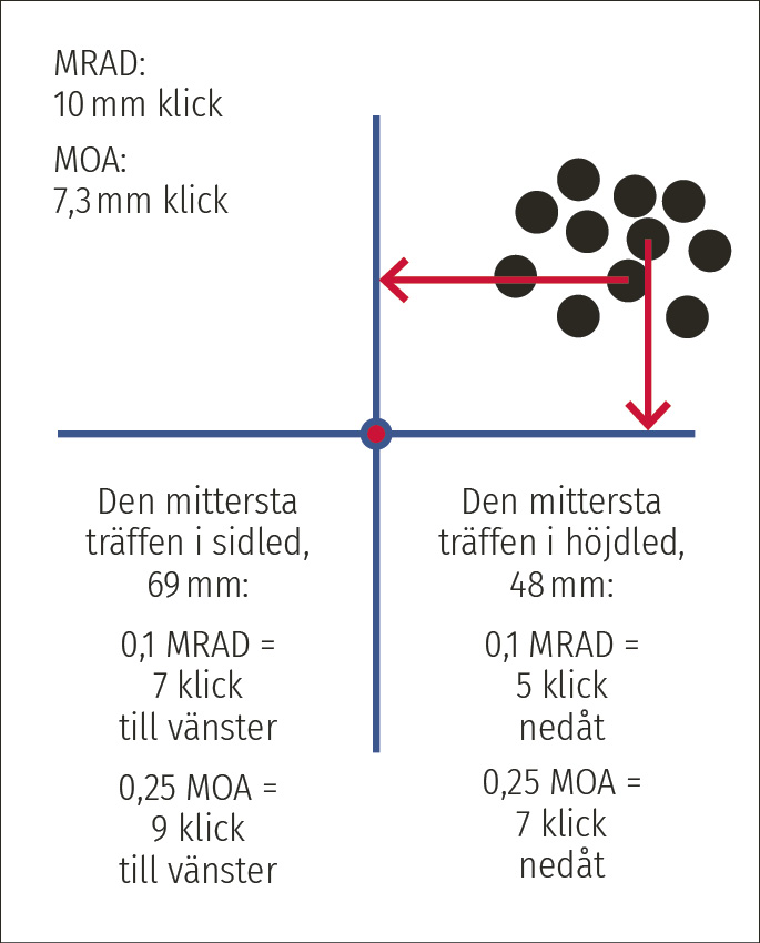 - Leta i träffbilden upp den mittersta träffen i sidled. Om du sköt elva skott så är den mittersta den sjätte från både höger och vänster. Mät den mittersta träffens avstånd i mm i sidled till siktpunkten och omvandla millimeter till klick. Om den mittersta träffen låg till höger om siktpunkten klickar du siktet åt vänster.