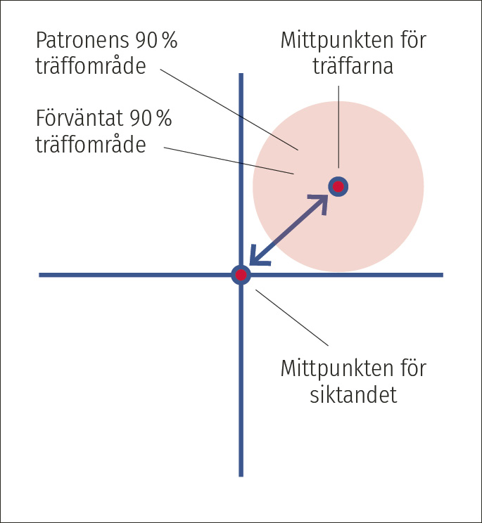 Den totala träffsäkerheten kan beskrivas som ett förväntat 90-procentigt träffområde. Detta är en cirkel runt siktpunkten inom vilken skottet träffar med 90 % säkerhet.