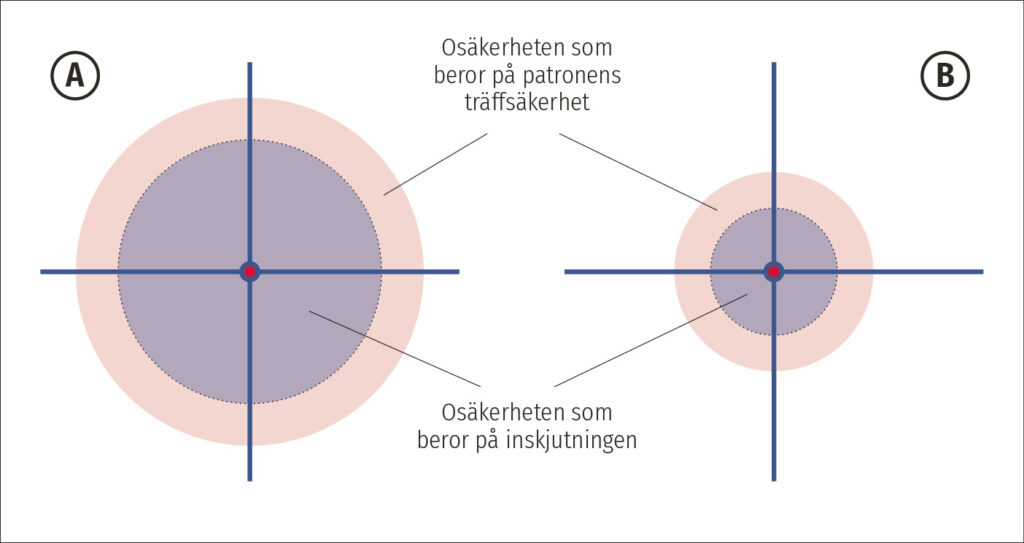 Om geväret är fullständigt inskjutet och vi med serier om tre skott får i medeltal 25 mm träffbilder med patronen, så träffar vi med 90 % sannolikhet inom en 38 mm cirkel. Klungorna med fem skott är i genomsnitt 30 mm och med tio skott kan vi förvänta oss 38 mm.