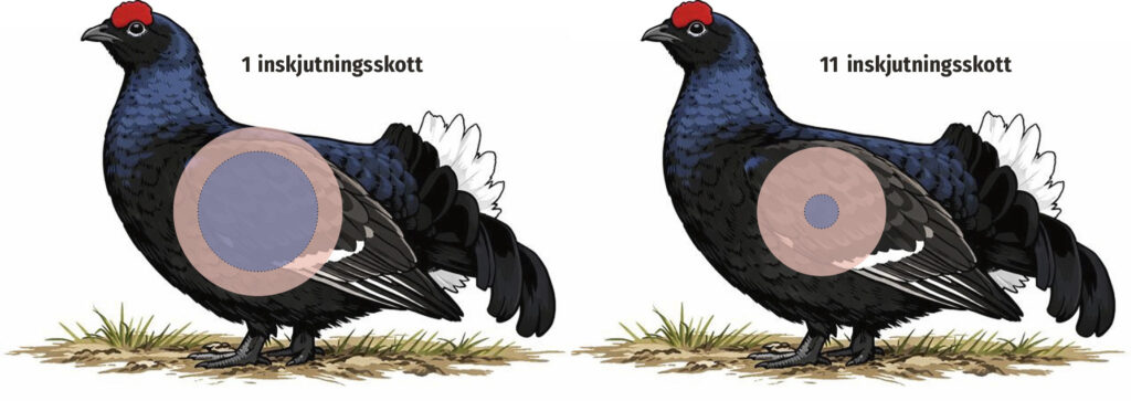 Patronens träffsäkerhet med det här geväret. Ju större spridning patronen har desto fler inskjutningsskott behöver skytten.