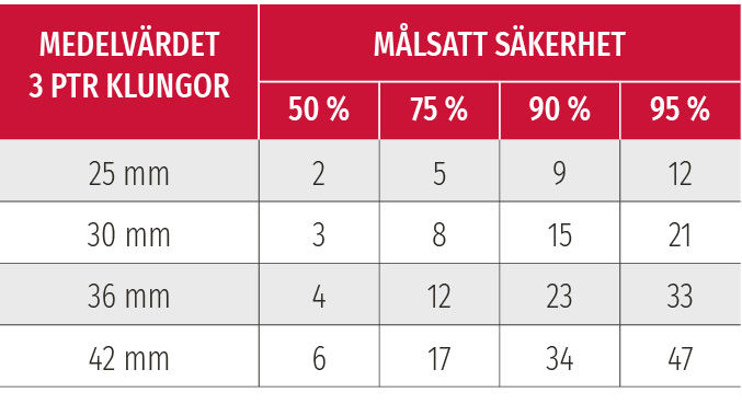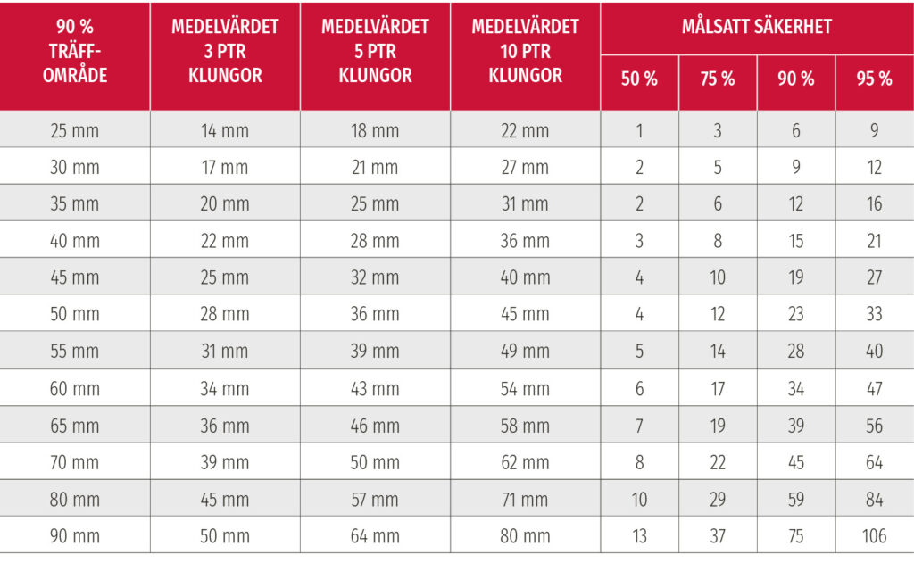 Men om medelvärdet för träffbilderna med tre skott hade varit 30 mm i stället för 25 mm, så skulle vi ha behövt 15 skott för att nå 90 procents säkerhet.