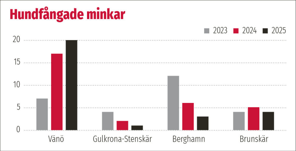 Antalet hundfångade minkar på Vänö har stigit brant och under 2025 tog vi tjugo stycken. Samtidigt har höstens minkavkastning, räknat per gillrad fälla, minskat klart.