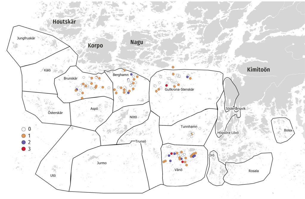 Under det första året fann vi 28 minkar i de 74 gillrade fällorna. I synnerhet i Vänö skärgård blev det många minkar; under hösten 2023 gick fjorton minkar i de tjugo fällorna. Även i de övriga områdena hade fällorna knipit minkar, men inte i samma stora omfattning. Det var uppenbart att minkarna i Skärgårdshavet inte var särskilt skygga för fällorna.