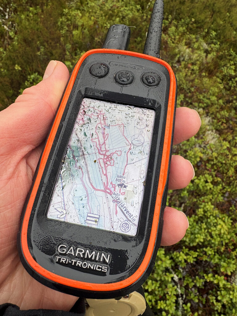 Domar-Janne sade att i den här trakten borde det nästan säkert finnas tjäderhönor och tjädertuppar – vid några minus också orrar. Min hund Juksu skäller med några minuters mellanrum. När vi traskar söderut på en skogsholme omgiven av myrar berättar GPS:en att hunden rör sig ett par hundra meter ifrån.