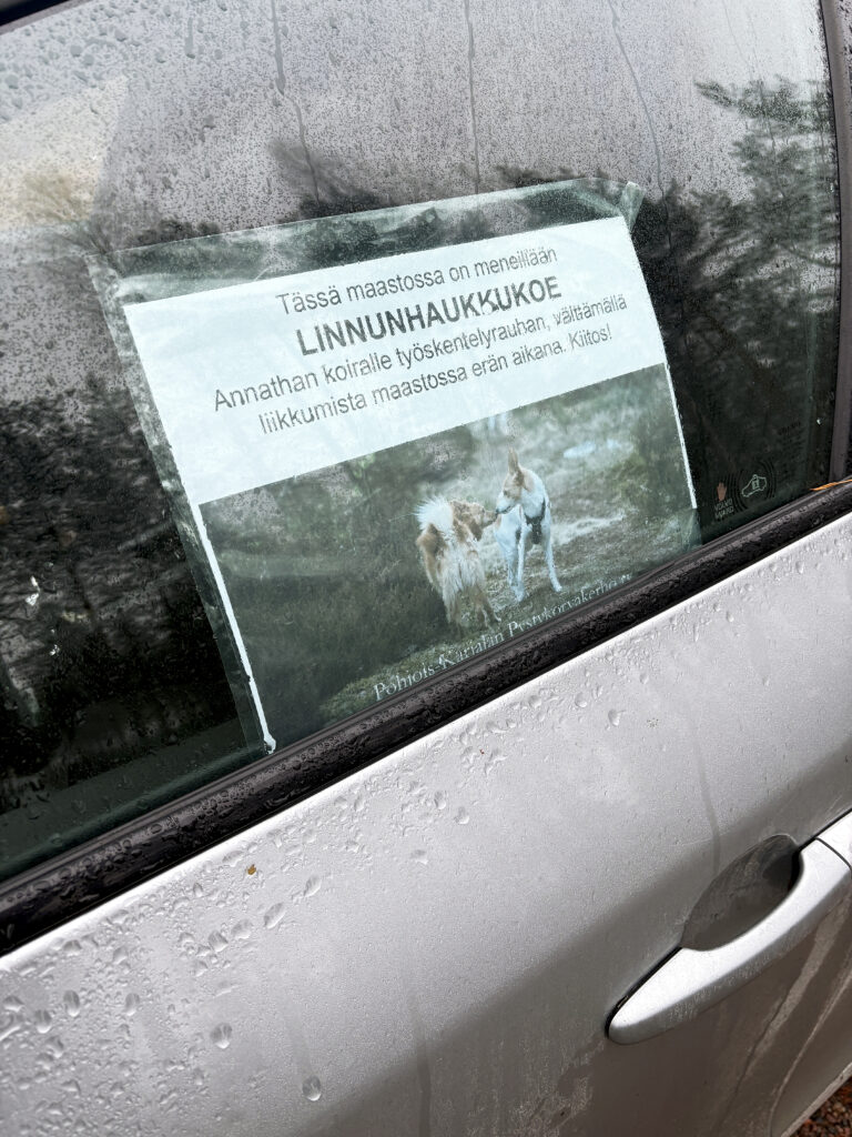 Vi hade precis börjat fågelskallprovet för hundförare som inte har gjort det förut. Kipinä-skallen som arrangeras av den nordkarelska spetshundsklubben Pohjois-Karjalan Pystykorvakerho hade samlat åtta deltagande hundekipage. I den regnvåta terrängen i Joensuutrakten hade, förutom vi, samlats sex andra norrbottenspetsar och en finsk spets med hundförare.