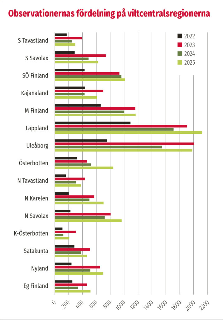 Mest observationer antecknades i de till arealen stora viltcentralsregionerna Lappland och Uleåborg. Flitigast antecknade jägarna (i förhållande till sitt antal) i viltcentralsregionerna Mellersta Finland, Sydöstra Finland och Lappland. Och minst i regionerna Nyland och Kust-Österbotten. En jämförelse rakt av mellan regionerna visar ändå inte aktiviteten hos jägarna i regionerna eftersom det förekommer att jägare antecknar observationer också i andra regioner.
