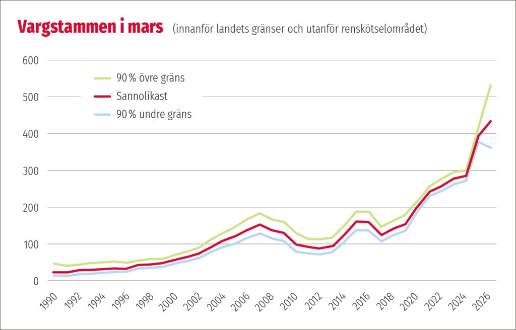 Diagrammet visar den uppskattade vargstammen i mars åren 1990-2025 och prognosen för mars 2026. Uppskattningen och prognosen gäller för den delen av vargstammen som lever innanför landets gränser och utanför renskötselområdet. Prognosen beskriver en situation utan stamvårdande jakt. Diagrammet visar det sannolikaste antalet vargar samt ett 90 procents konfidensintervall som beskriver uppskattningens osäkerhet.