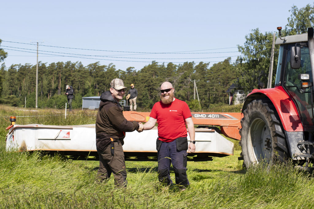 – Vi har på många sätt försökt hindra djuren från att råka ut för slåttermaskinen. Medlemmar i vår jaktförening har kammat igenom åkrarna och kollat dem. Vi har satt upp skrämmor dagen innan slåttern för att störa rågetterna och hindarna så att de för sina ungar i säkerhet, berättar Andreas och Johan.